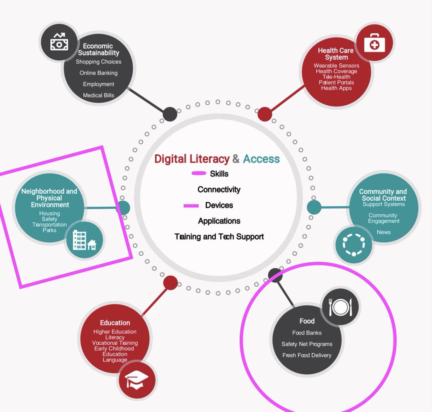 Figure 1 of this blog post shows Figure 1 from Digital inclusion as a social determinant of health (2021). The elements I think are most important are outlined in pink. The elements that stood out most to me had to do with access to everyday survival needs. I had not considered access to food when thinking about access to telehealth. Technology could potentially mediate the impact of food deserts. Similarly, neighborhood and environment are outlined. If someone does not have access to a consistent resting spot, technology would be much harder to manage. Meeting biological and physiological needs increasingly relies on technology.